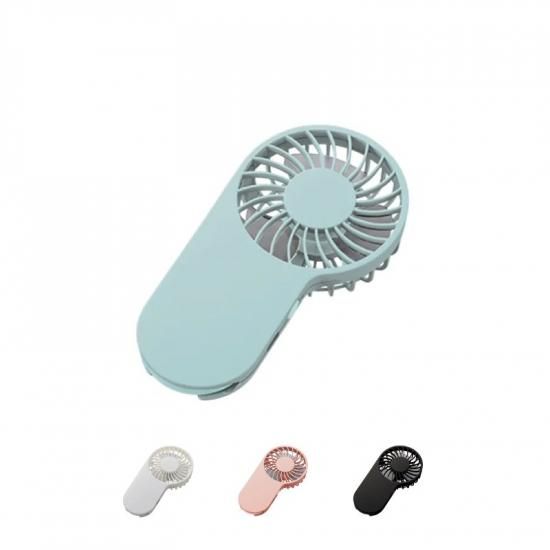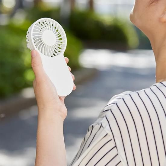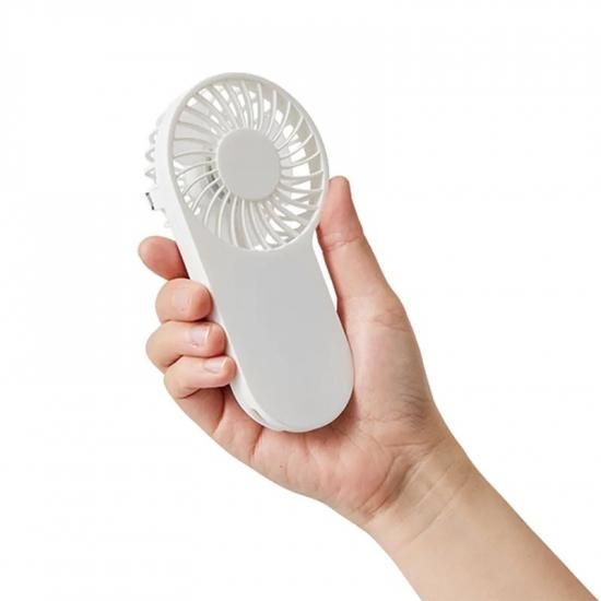 持ち歩きできるハンディファン、充電式タイプです。軽量でコンパクトな仕様で印刷面で取りやすく、本体に収納しているフックを取り出すことでバッグ等にひっかけたりフックをスタンドにして使うこともできます。