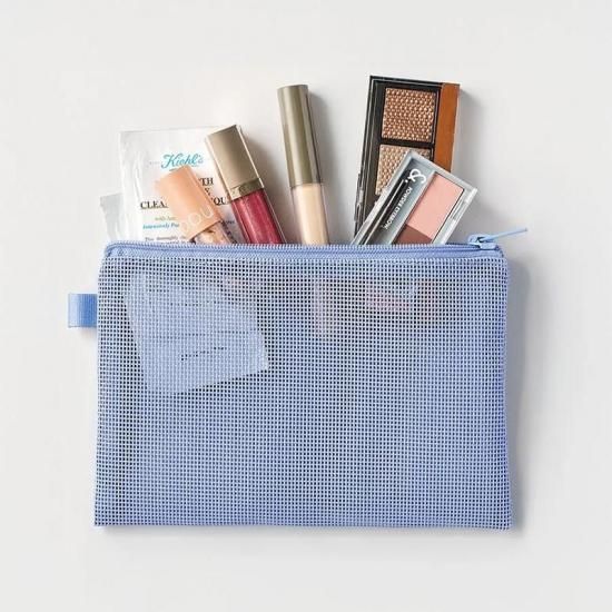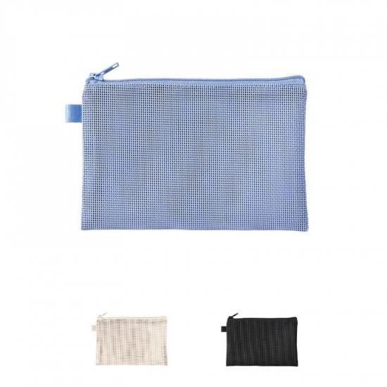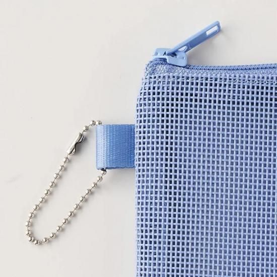 メッシュ仕様のポリエステル素材フラットタイプ、小さめサイズのポーチです。全面しっかりとしたメッシュ仕様で、中身を確認が確認しやすいポーチです。