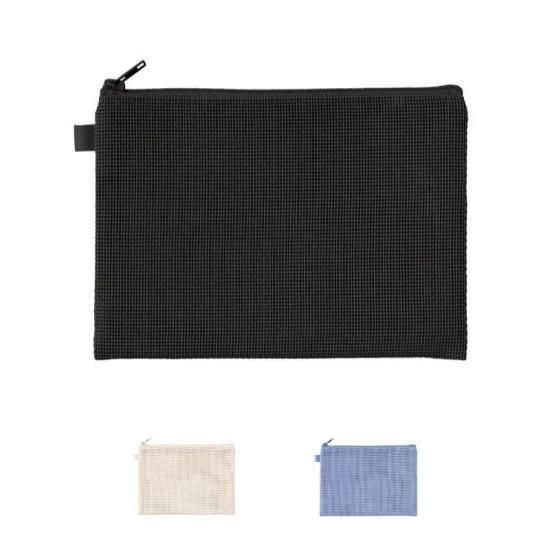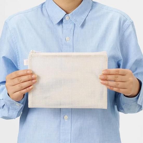 メッシュ仕様のポリエステル素材フラットタイプ、ミドルサイズのポーチです。全面しっかりとしたメッシュ仕様で、中身を確認が確認しやすいポーチです。