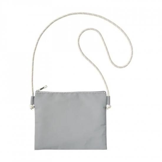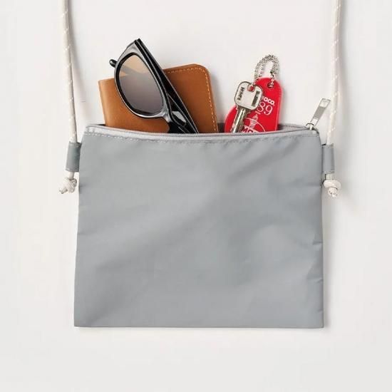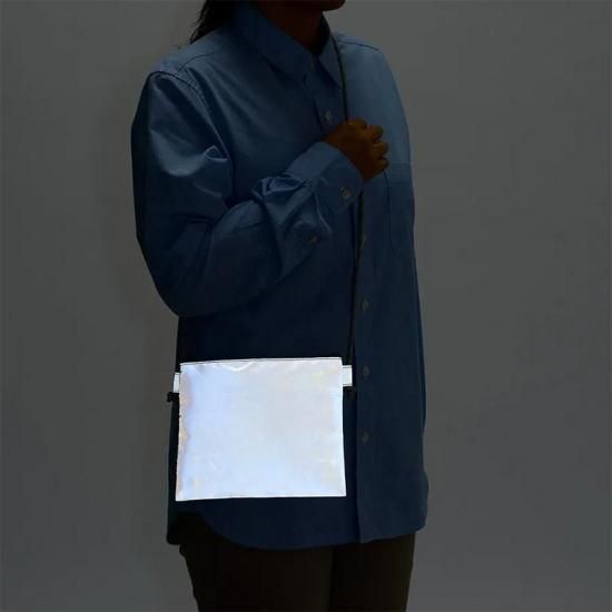 ポリエステル素材、小さめサイズのサコッシュです。口元にはファスナー付き、リフレクターコーティングされているので暗闇で光るサコッシュです。