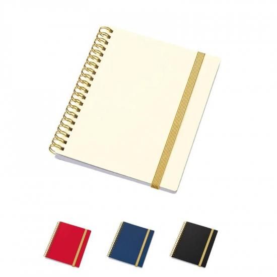 ゴールドのリングとゴムが特徴的なハンディサイズのノートです。ノート用紙は6mm幅罫線になります。
