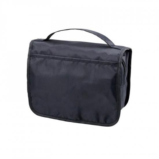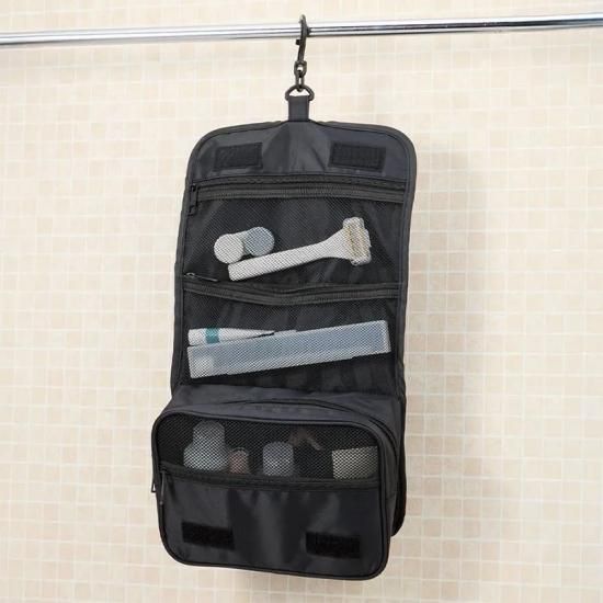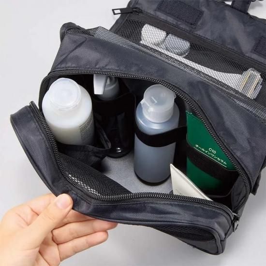 ポリエステル素材のハンギングタイプ、三段式のポーチです。ベルトで吊り下げて使えるので、旅先などで役に立つポーチです。